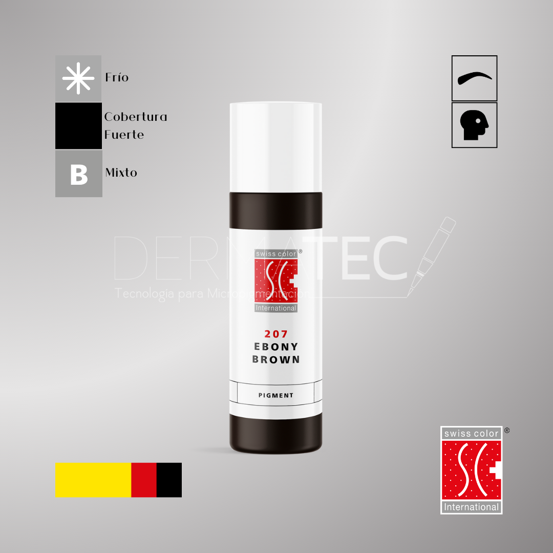 Ebony Brown 207 es uno de los mejores pigmentos para dar a las cejas una expresión más intensa. Al ser un pigmento para cejas y cuero cabelludo bastante frío; pero sin subtonos azulados, es especialmente adecuado para los tipos de piel más oscuros. Ebony Brown 207 es el pigmento más recomendado para aumentar las partes cenizas en una mezcla.